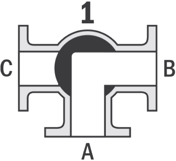 ![]() | Положение 1: перекрыт выход C, поток движется в направлении A–B. | |