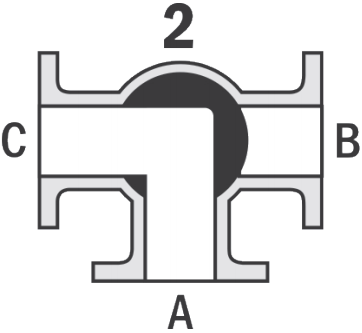 ![]() | Положение 2: перекрыт выход B, поток движется в направлении A–C. | |