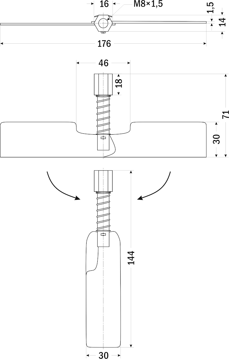 - Лопасть Л7С − единственный вариант лопасти, который позволяет установить РДУ в емкостях, внутрь которых нет легкого доступа. Для размещения РДУ достаточно просверлить отверстие и приварить бобышку, далее лопасть Л7С складывается, помещается в отверстие бобышки и затем Л7С сама расправляется внутри емкости. Также это единственный вариант лопасти, который позже позволяет вынуть РДУ с лопастью для замены, ремонта, перемещения в другую точку измерения и т.д.